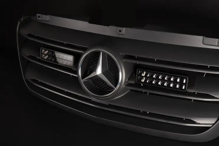 Markedets kraftigste grillkit leveres med mørke reflektorer som harmonerer med bilens grill og smelter fint inn i grillen på en Mercedes E-Sprinter.