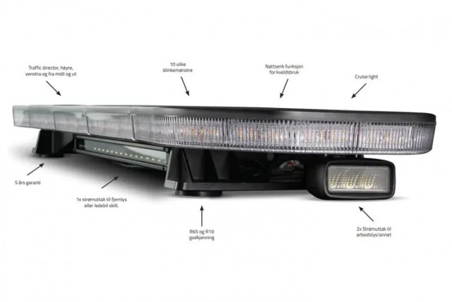 Bjelken er svært enkel å koble opp og styres. Bjelken leveres uten et kontrollpanel, men har i stedet en ledning med løse ledere som styres med styrestrøm signaler, samt. strømledninger for batteriet. Det er innebygd minnefunksjon på blinkemønsteret slik at du kan velge din favoritt, og aldri bytte den igjen. Det vil også være veldig enkelt å koble opp en LED-bar i front og 2 stk arbeidslys på sidene.